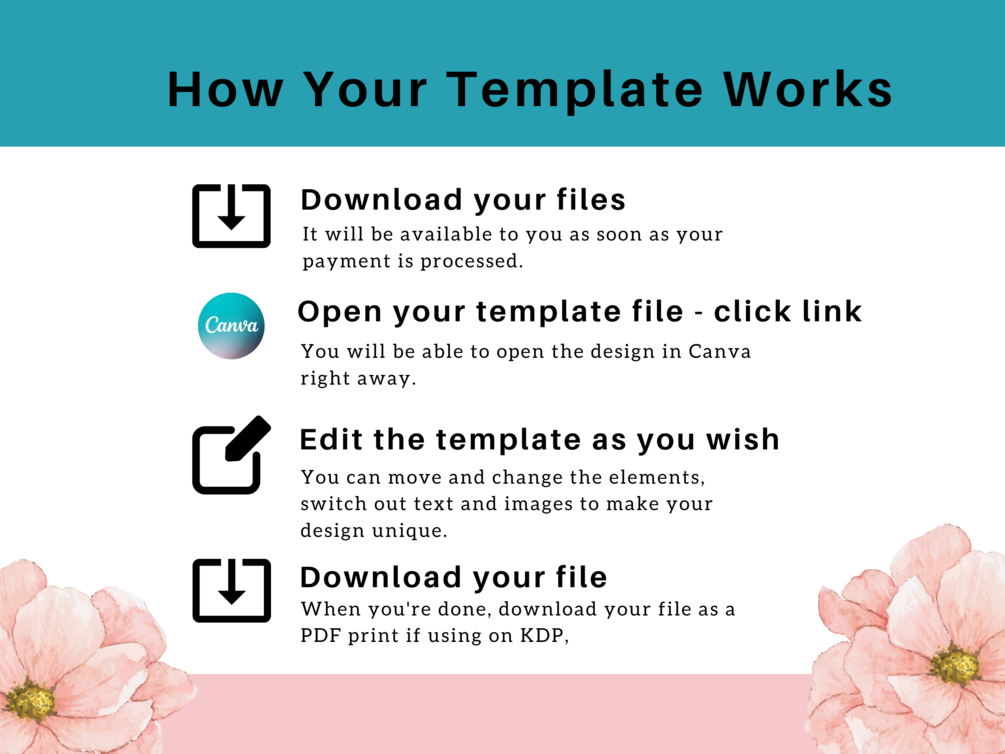 The next is a link to your CANVA template document. Here you can make any changes to the lined page to make it unique. For example; changing the text or adding your own images. You will then need to duplicate your page to however many pages you want.