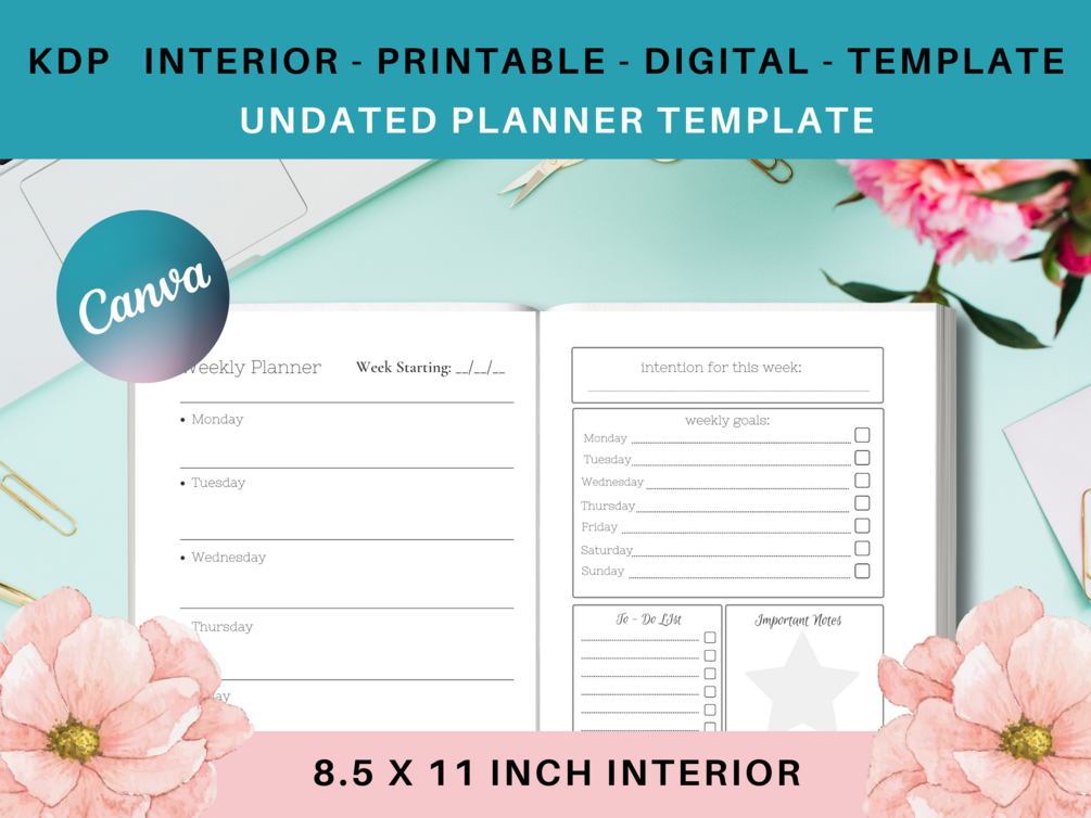 KDP Interior - Undated Planner - 120page - 8 x 11.5 Inch Undated Planner Interior - No Bleed - CANVA template included.